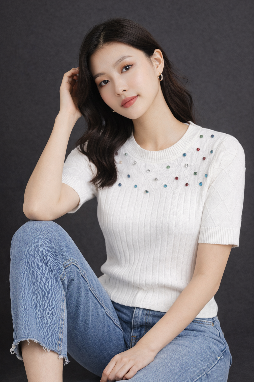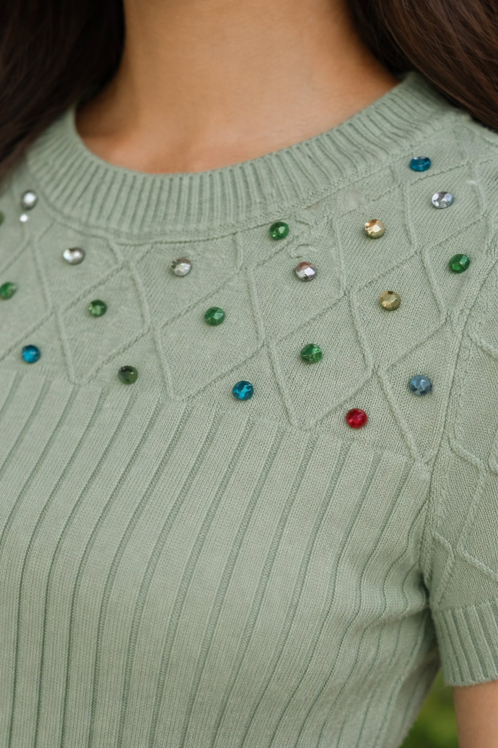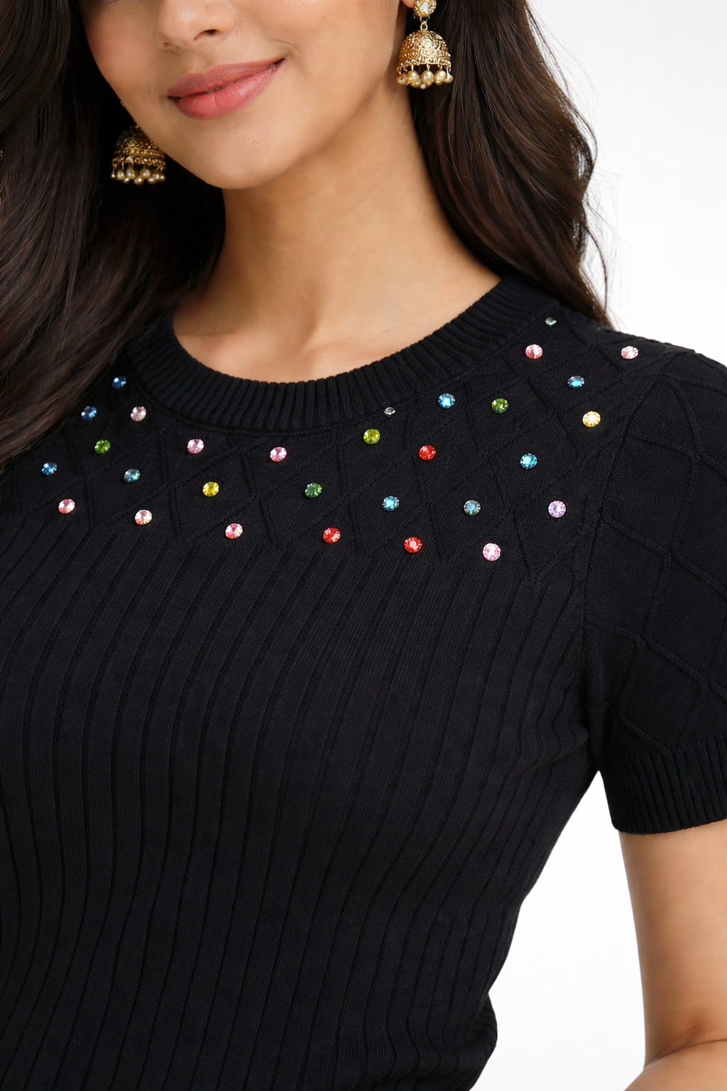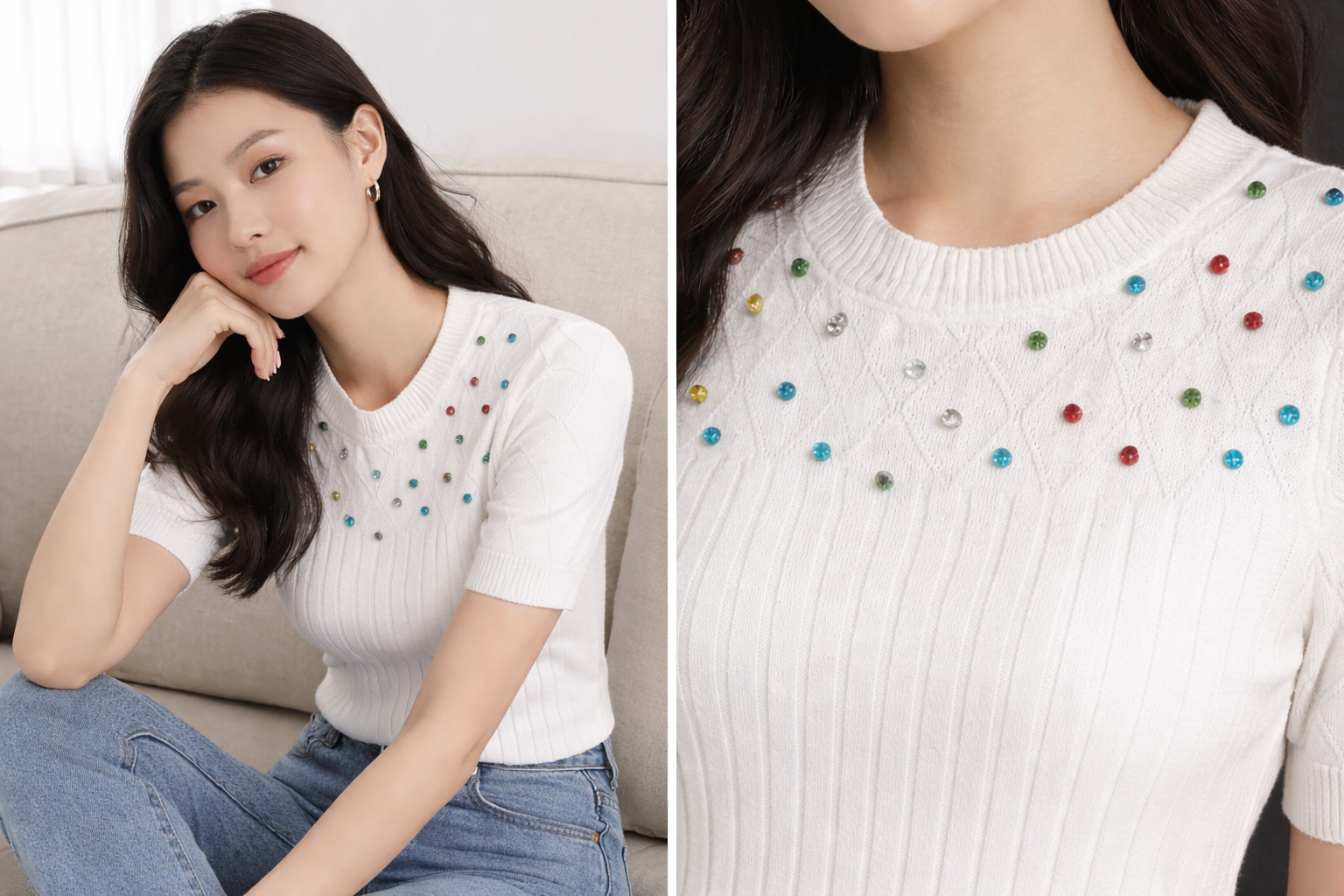 Dress it up with tailored trousers, satin skirts, or faux-leather pants for evenings, or keep it casual with denim and sneakers for daytime. The subtle embellishment makes it easy to transition from work to weekend with minimal styling.